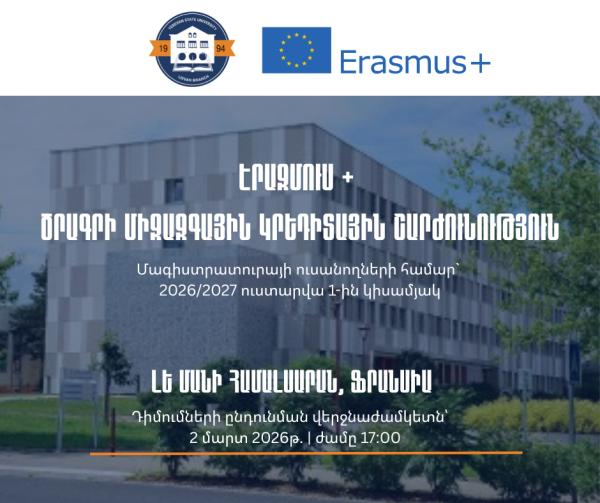 Հարգելի՛ ուսանողներ, տեղեկացնում ենք, որ Էրազմուս + միջազգային կրեդիտային շարժունության գործողության շրջանակում Երևանի պետական համալսարանիև Լորենի համալսարանի Մին Նանսի (Ֆրանսիա) դպրոցիմիջև կնքված պայմանագրով նախատեսվում են մագիստրատուրայի ուսանողների համար շարժունություններ՝ 2026-2027 ուստարվա 1-ին կիսամյակում ուսանելու / պրակտիկա անցնելու նպատակով: