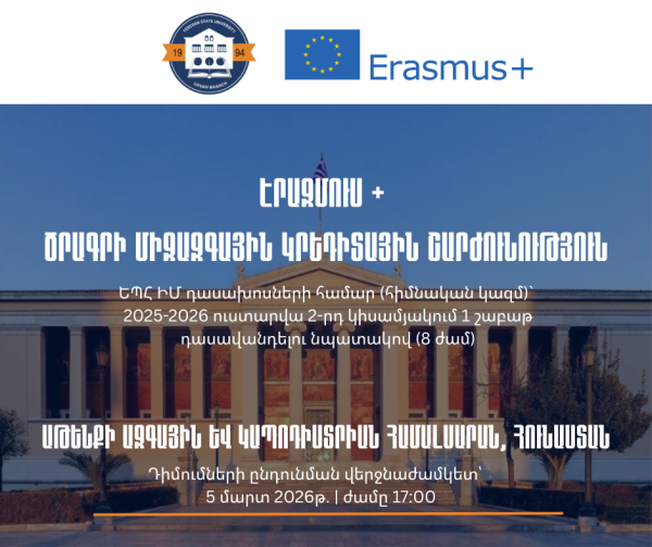 Հարգելի՛ դասախոսներ, տեղեկացնում ենք, որ «Էրազմուս+» միջազգային կրեդիտային շարժունության գործողության շրջանակում Երևանի պետական համալսարանի և Աթենքի ազգային և կապոդիստրիան համալսարանի միջև կնքված պայմանագրով նախատեսվում են շարժունություններ դասախոսների համար (հիմնական կազմ)՝ 2025-2026 ուստարվա 2-րդ կիսամյակում 1 շաբաթ դասավանդելու նպատակով (8 ժամ):