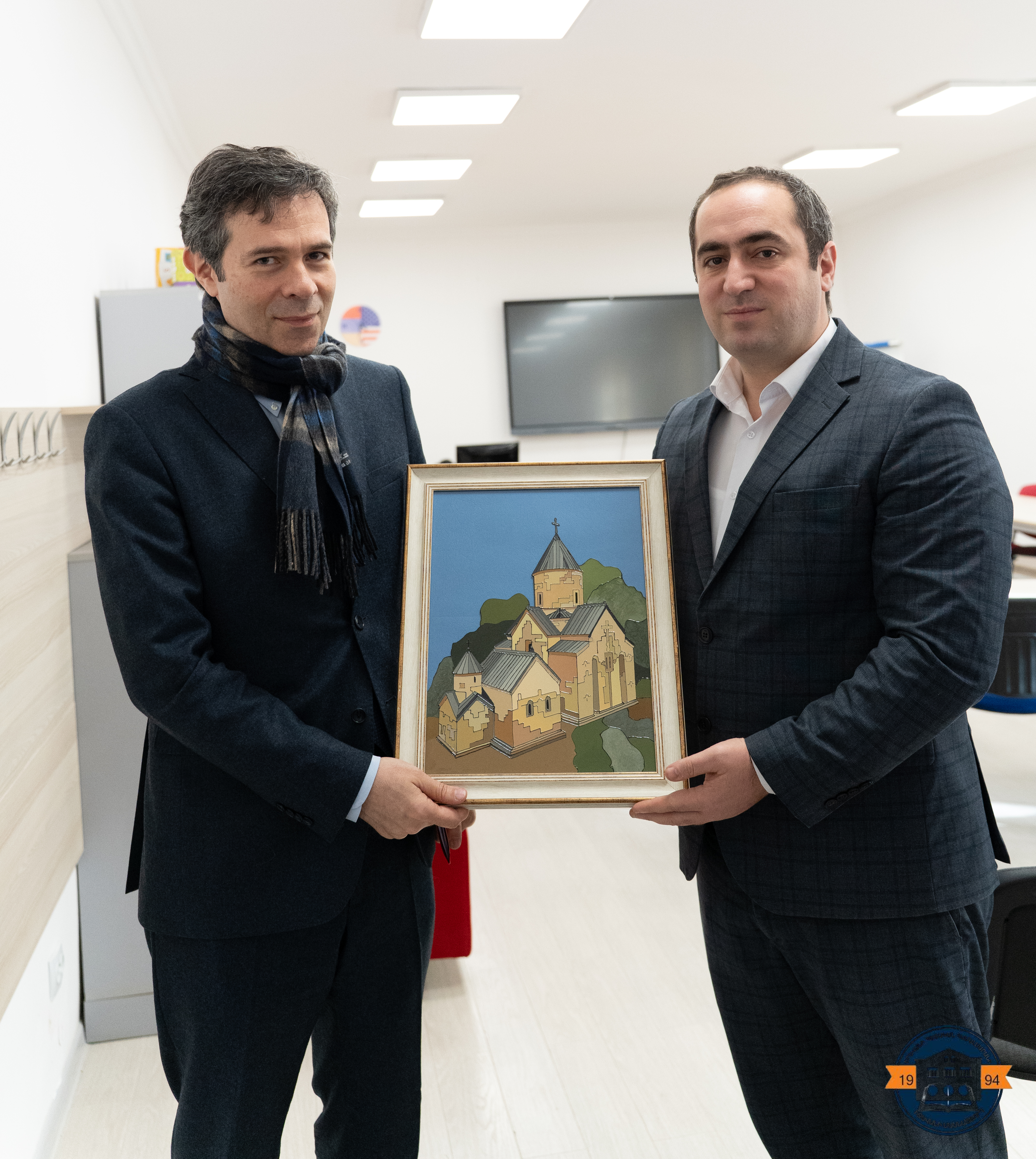 The Director of YSU IB once again thanked the Ambassador Extraordinary and Plenipotentiary of Greece in the RA, Christos Sofianopoulos, for his visit to the YSU Ijevan branch and his willingness to cooperate, and on behalf of the branch presented him with the “Varagavank” stained glass window by Lena Khalatyan, a fourth-year student of the “Design” educational program of the Faculty of Applied Arts.