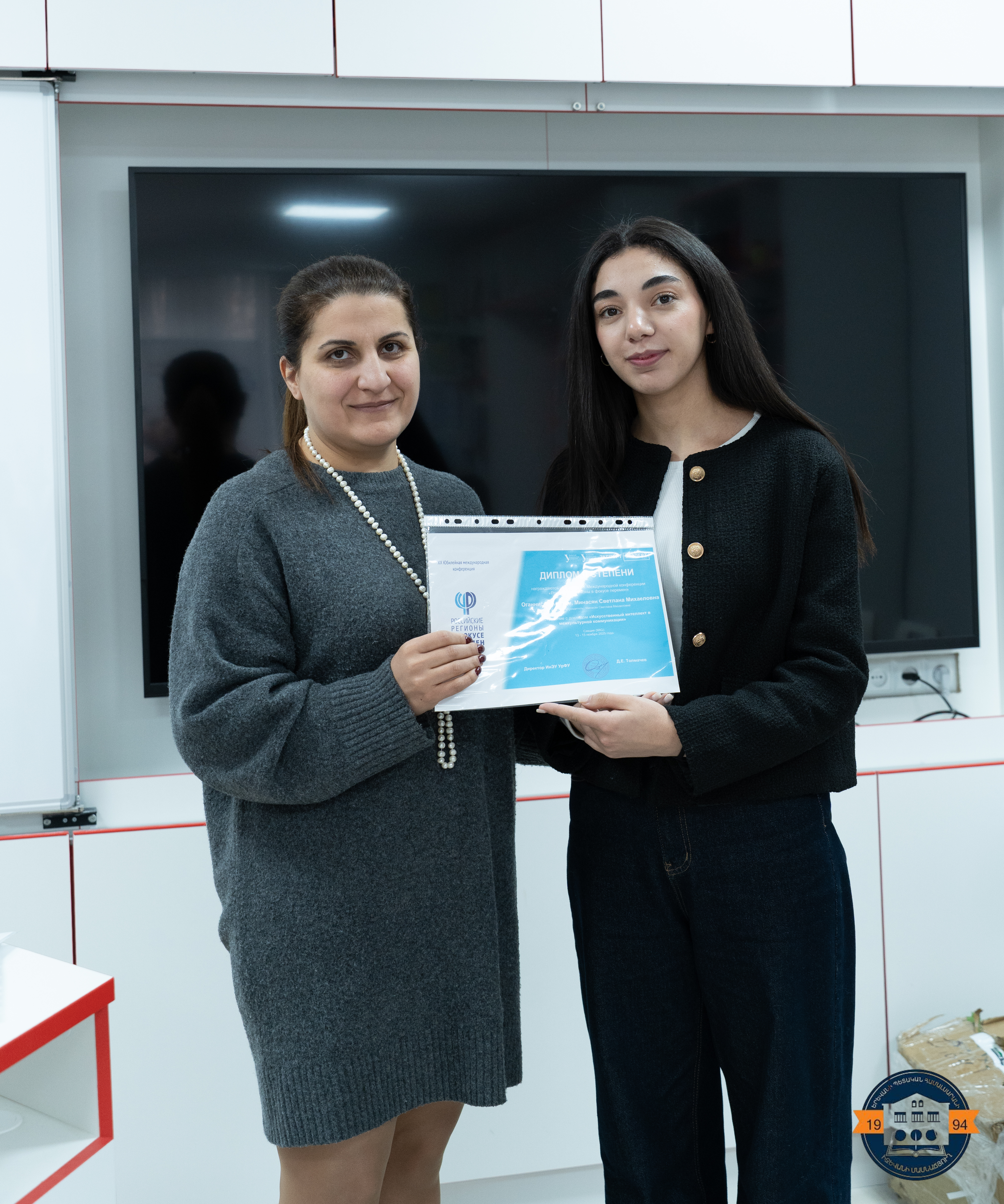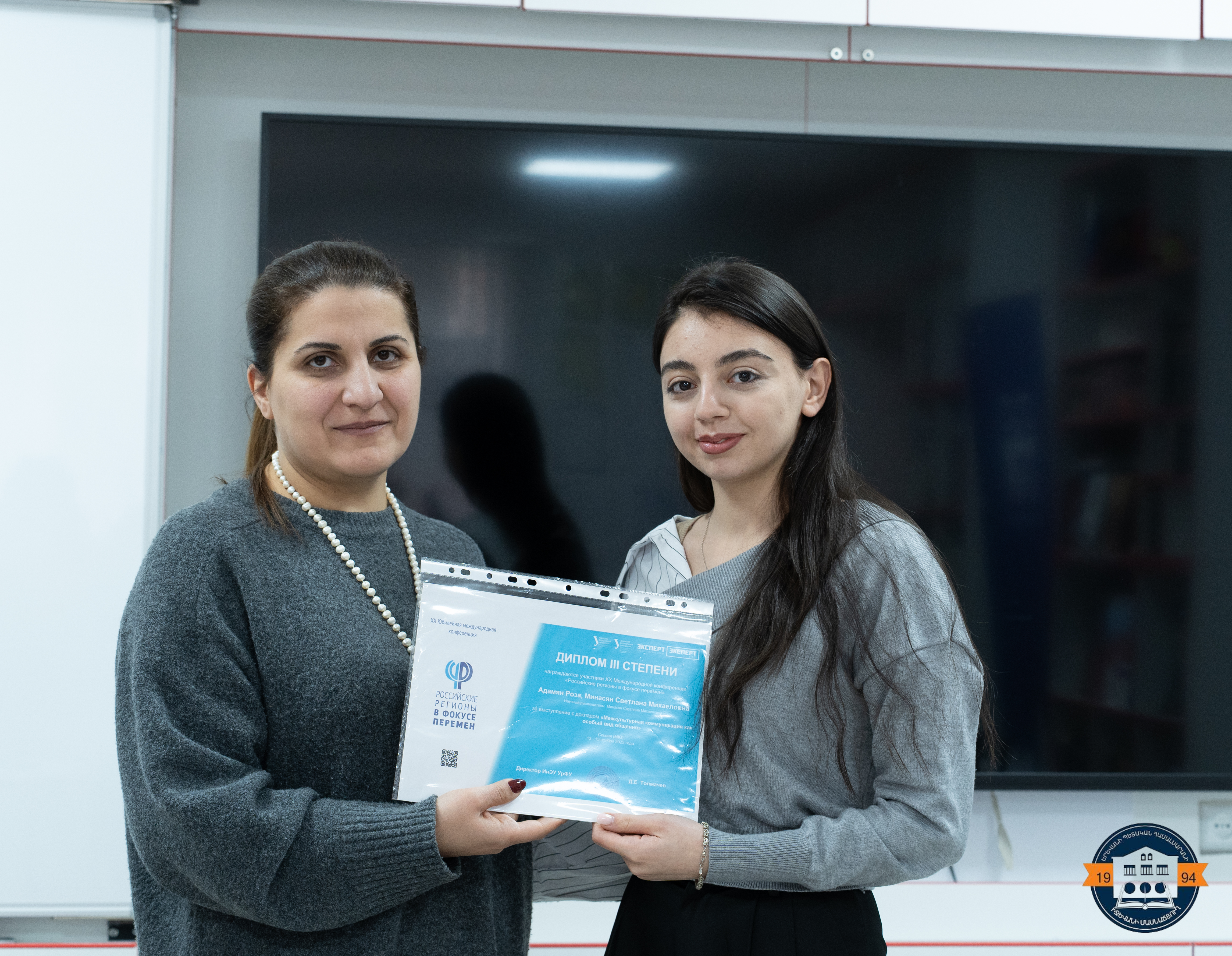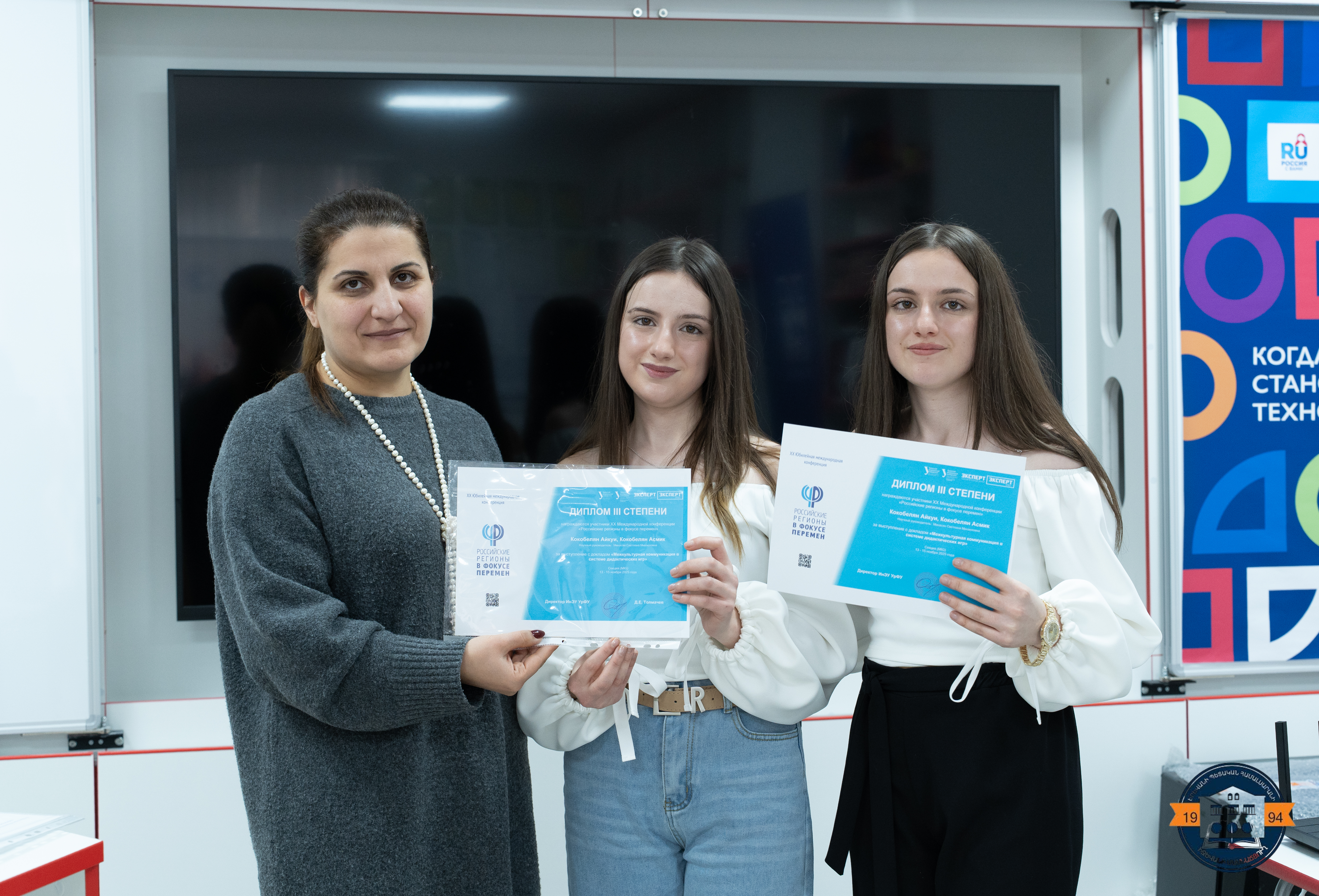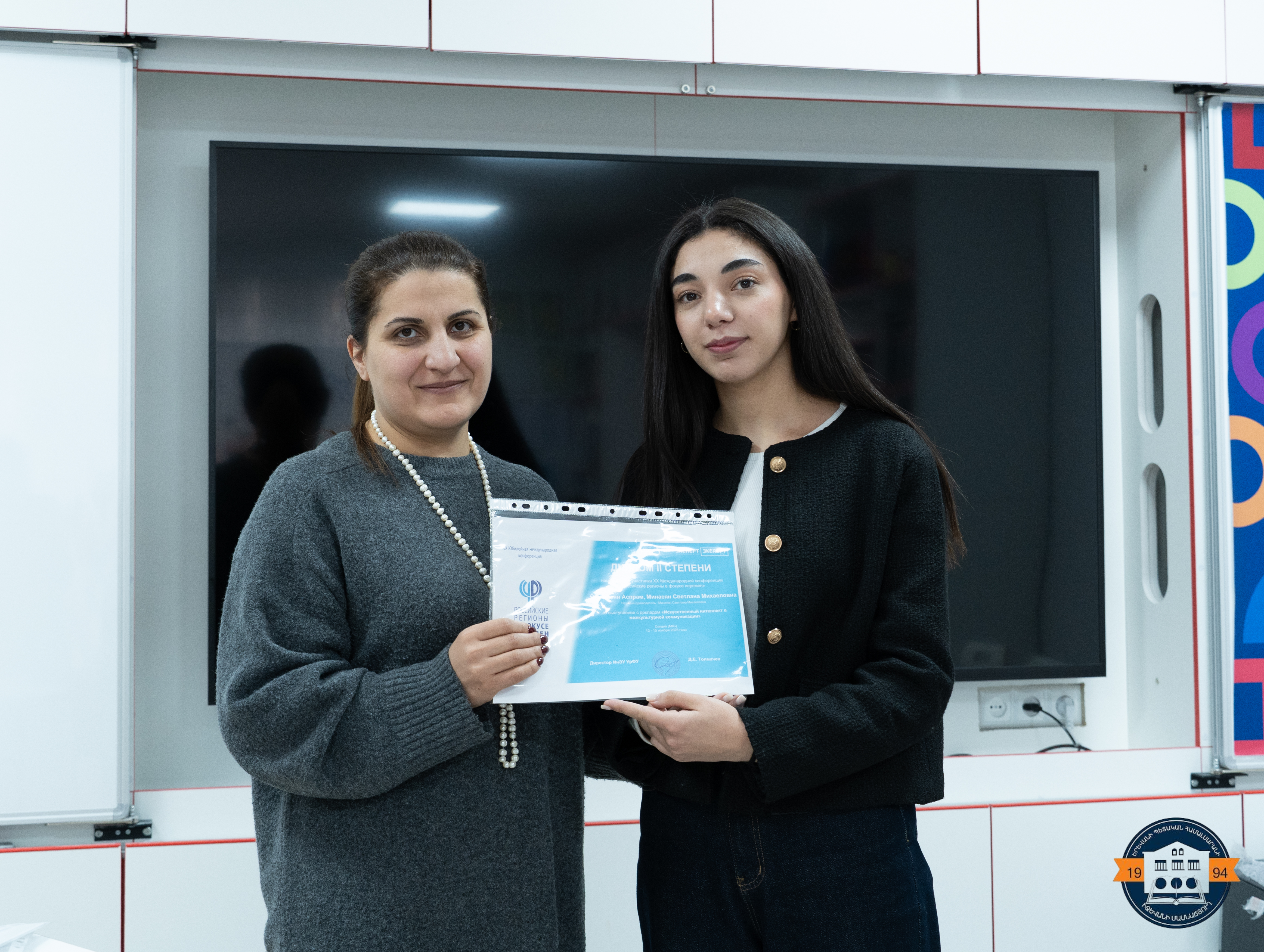Aspram Hovhannisyan presented a report on “Artificial Intelligence in Intercultural Communication” and was awarded a second-class diploma. Roza Adamyan presented a report on “Intercultural Communication as a Special Type of Communication”, Haykuhi and Hasmik Kokobelyan presented a report on “Intercultural Communication in the System of Didactic Games”. All three speakers received a third-class diploma.