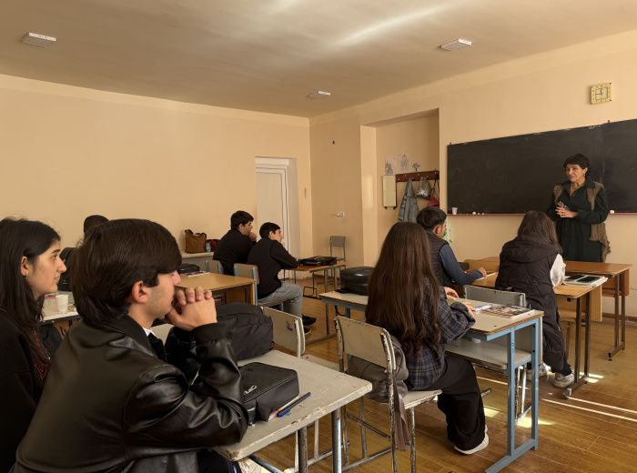 On November 5, 2025, a meeting with Catherine Lesemple, a member of the "Armenian-French Friendship and Exchange" Union, was held at Ijevan branch of YSU. The meeting was attended by the Director of YSU IB M. Otaryan, Acting Dean of the Faculty of Humanities N. Grigoryan, Head of the "French Language and Literature" Educational Program R. Mirzoyan, French volunteer Cordelia Dex, the head of the Angela Vanesyan Francophonie Center Mary Gasparyan, and students.