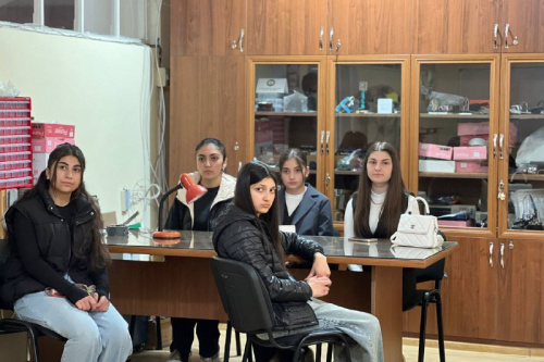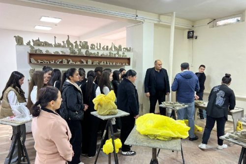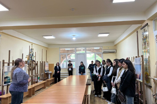 A tour of the branch's faculties was organized for the students. Lecturers of the Faculty of Applied Arts A. Chibukhchyan and T. Bagamyan presented the students' works in the fields of sculpture, pottery, carpet weaving, and glass painting in the studios. Lecturer of the Faculty of Natural Sciences G. Gulakyan introduced the students to the students' research works and technological developments in the Agrotechnology Laboratory.