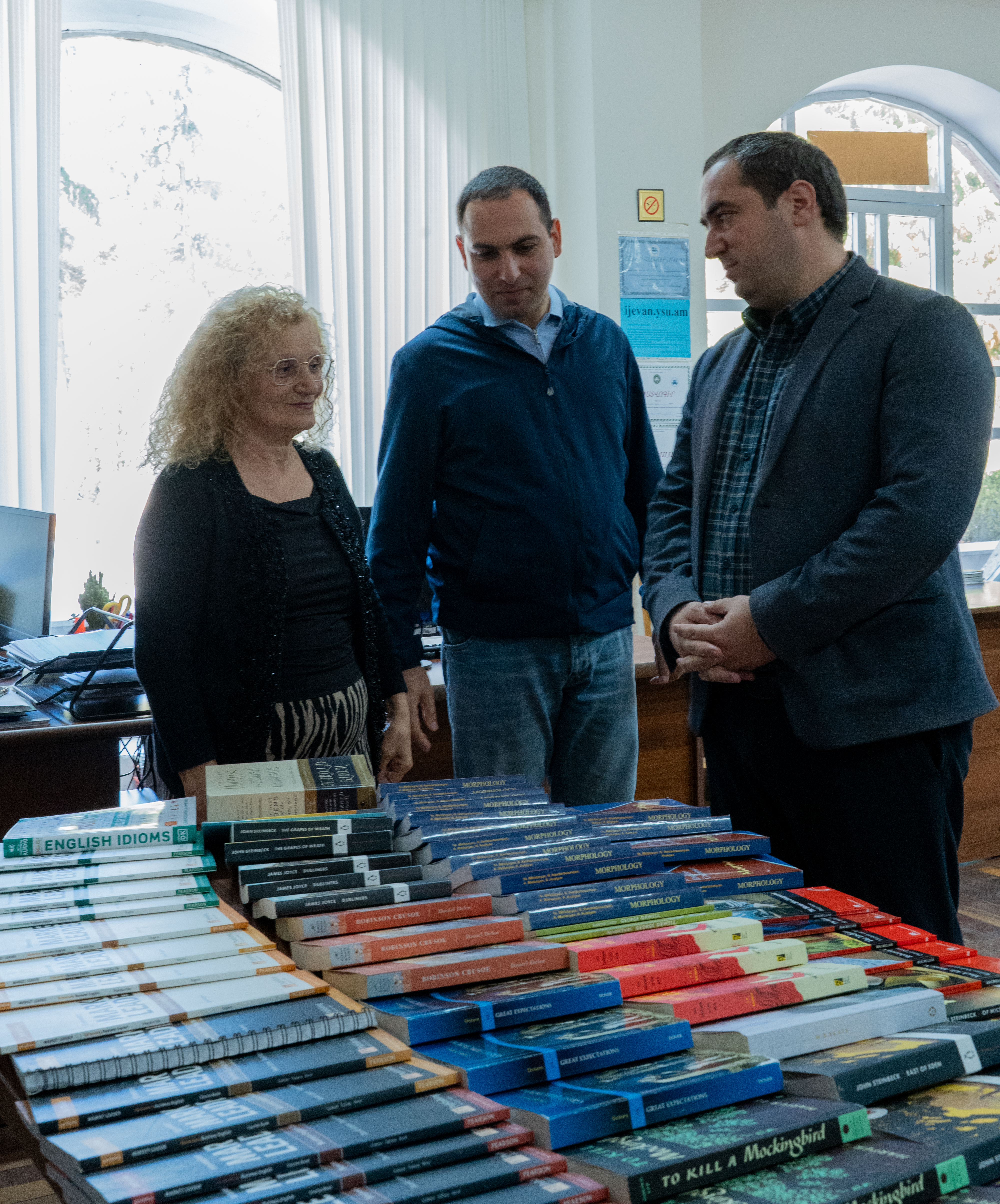 During the exhibition of donated literature, the lecturers of the Department of Foreign Languages, together with M. Otaryan and the Director's Advisor A. Makaryan were presented with the direction of the donated literature and the expediency of teaching. The Director thanked Tamara England, a former volunteer of the US Peace Corps, for the donation of a large amount of literature, and E. Temrazyan, who supported the implementation of the initiative, emphasizing the importance and significance of such initiatives from the point of view of ensuring the educational and scientific requirements of the YSU Ijevan branch.
