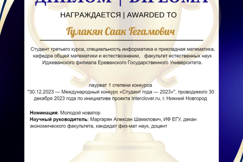 Օրերս ամփոփվել են 2023 թ. դեկտեմբերի 30-ին Ռուսաստանի Նիժնի Նովգորոդ քաղաքում անցկացված «Տարվա ուսանող 2023» միջազգային մրցույթի արդյունքները, որոնց համաձայն՝ ԵՊՀ ԻՄ բնական գիտությունների ֆակուլտետի «Ինֆորմատիկա և կիրառական մաթեմատիկա» կրթական ծրագրի 3-րդ կուրսի ուսանող Սահակ Գեղամի Գուլակյանը 5 անվանակարգում արժանացել է դիպլոմների:
