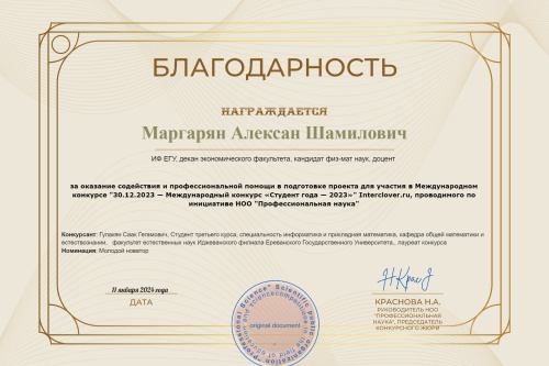 Միջազգային մրցույթին նախապատրաստվելու գործում Սահակ Գուլակյանին ցուցաբերված մասնագիտական աջակցության և տարբեր անվանակարգերում դիպլոմներ ստանալու համար շնորհակալագրերի է արժանացել գիտական ղեկավար, ԵՊՀ ԻՄ ընդհանուր մաթեմատիկայի և բնագիտության ամբիոնի դոցենտ, ֆ.մ.գ.թ. Ալեքսան Մարգարյանը: