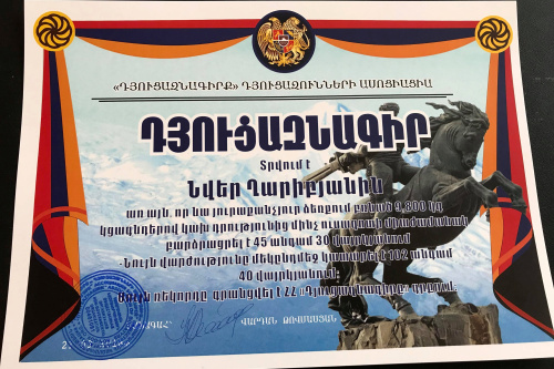 - 2018թ. սեպտեմբերի 16-ին «Դյուցազնագիրք» դյուցազունների ասոցացիայի նախագահ Վարդան Թովմասյանի գլխավորած հանձնաժողովի կողմից գրանցվել է համապատասխան ռեկորդը (ուժային վարժությունից) և հոկտեմբերի 10-ին տրվել է հավաստագիրը: