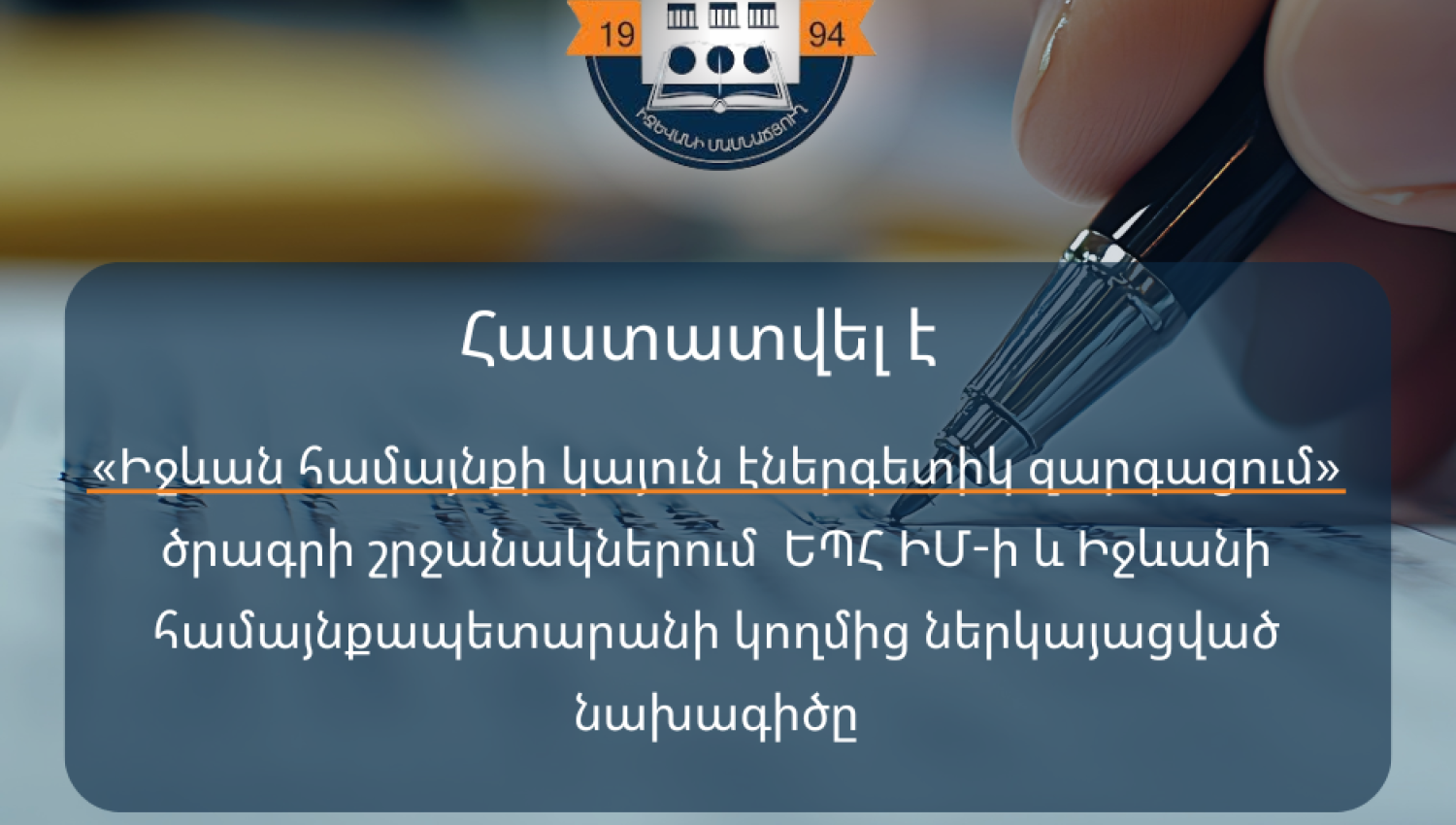 2025 թ․ մարտին ԵՊՀ Իջևանի մասնաճյուղը և Իջևանի համայնքապետարանը՝ որպես համահայտատուներ, դիմել էին GIZ-ի հայաստանյան գրասենյակի կողմից իրականացվող Տեղական զարգացման հիմնադրամի (ՏԶՀ) «Վերականգնվող էներգիա (ՎԷ) և էներգաարդյունավետություն (ԷԱ)» ծրագրին՝ ներկայացնելով «Իջևան համայնքի կայուն էներգետիկ զարգացում» նախագիծը: