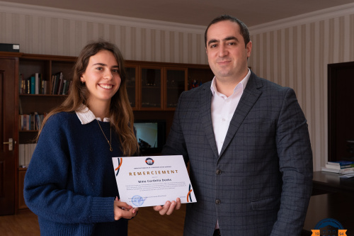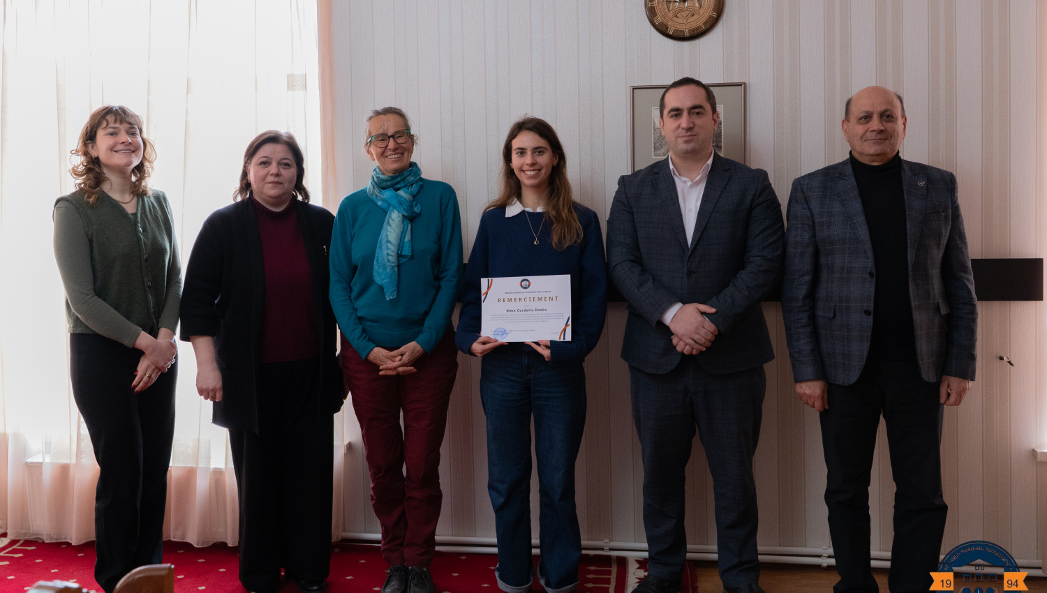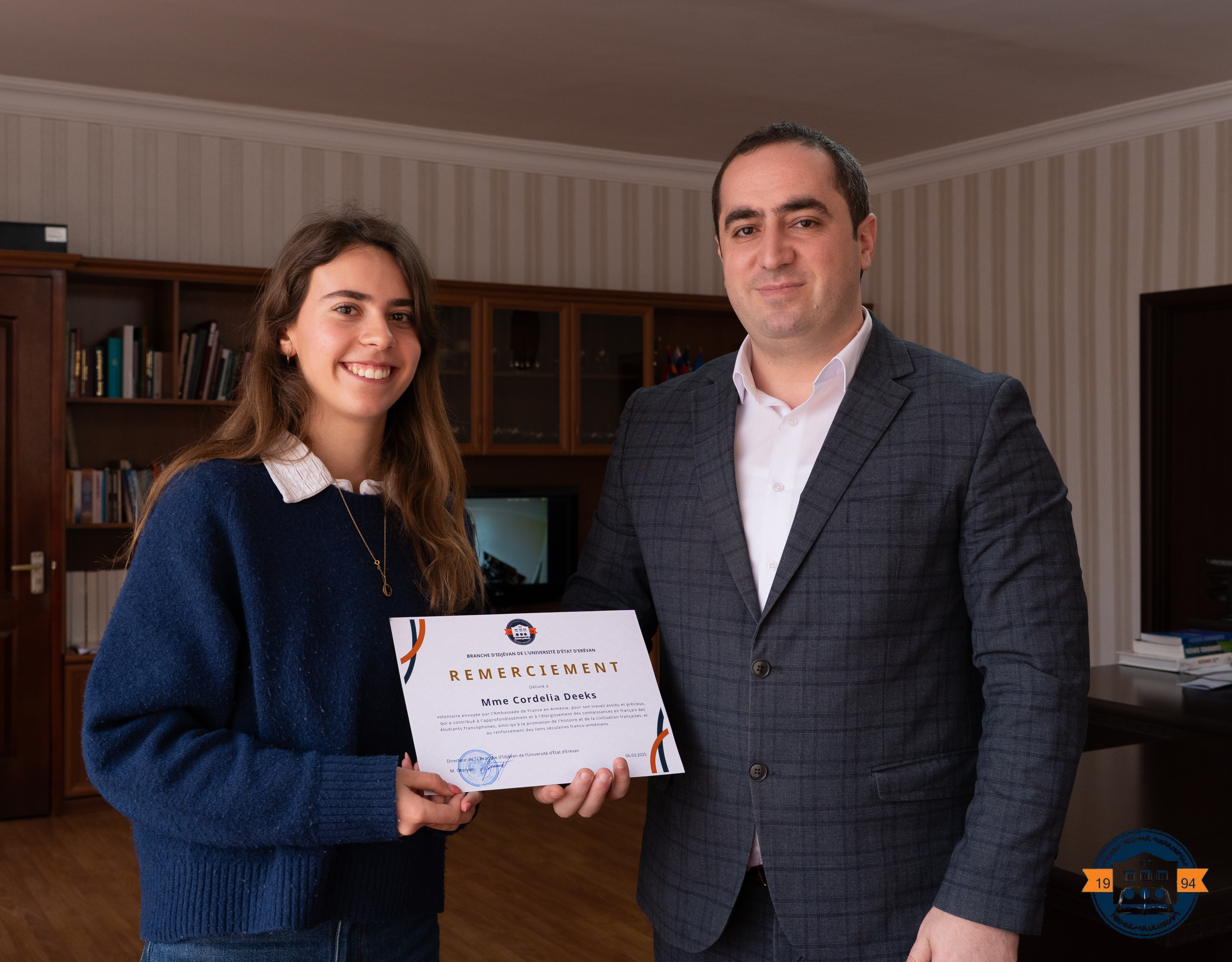 Տնօրենը շնորհակալություն հայտնեցԴ. Վեյսին և ՀՀ-ում Ֆրանսիայի Հանրապետության դեսպանությանը՝ ԵՊՀ ԻՄ «Ֆրանսերեն լեզու և գրականություն» կրթական ծրագրի ուսանողներին աջակցելուհամար, շնորհակալագիր հանձնեց Կ. Դեկսին՝ մասնաճյուղում նրա իրականացրածգործունեության համար: