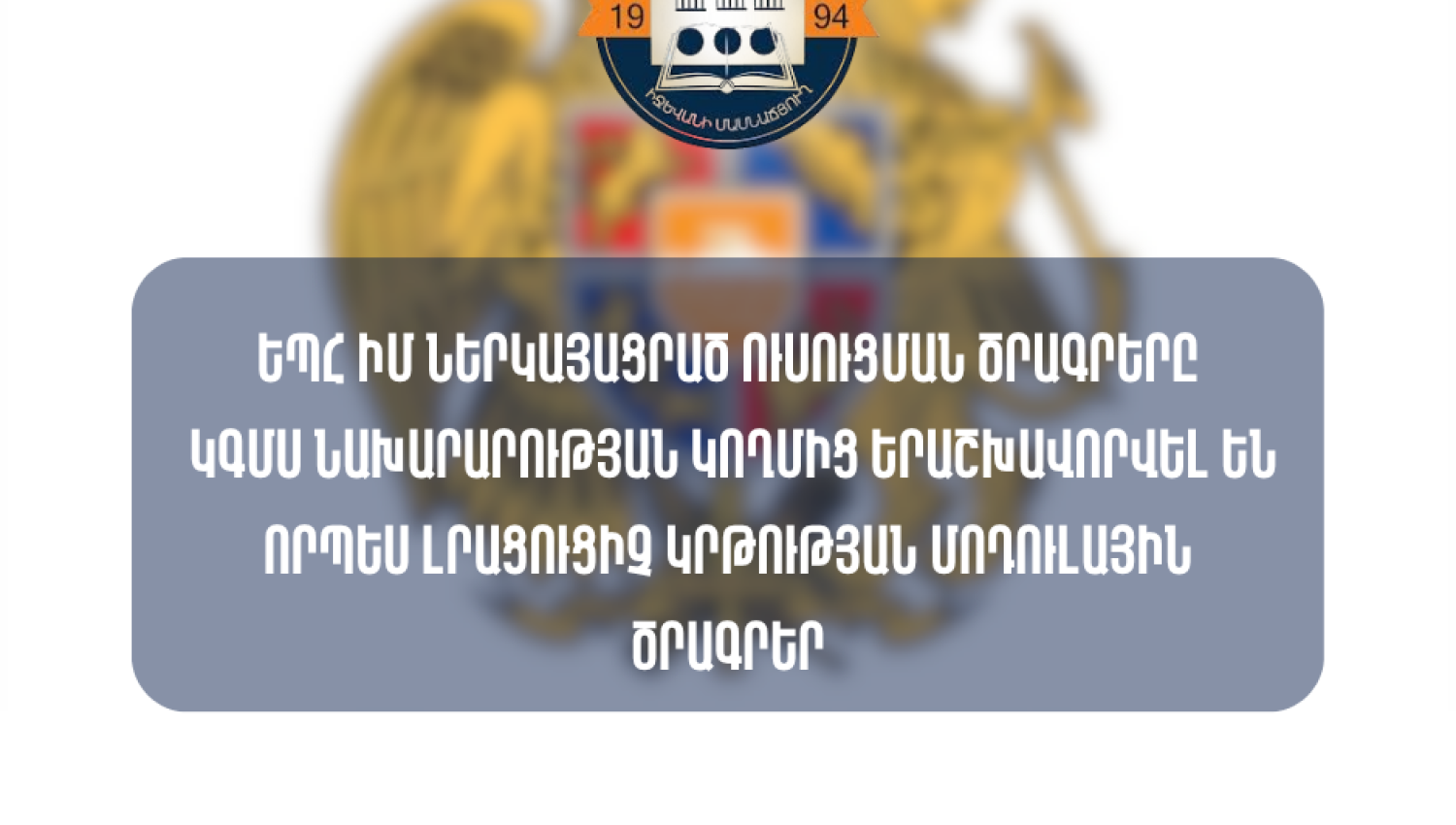 Ուրախ ենք տեղեկացնել, որ ԿԳՄՍ նախարարի՝ ս.թ. մարտի 26-ի № 471-Ա/2 հրամանի համաձայն՝ երաշխավորվել են ԵՊՀ Իջևանի մասնաճյուղի կողմից ներկայացված ավելի քան երեք տասնյակ ուսուցման ծրագրեր՝ որպես լրացուցիչ կրթության մոդուլային ծրագրեր: Դրանք նախատեսված են տեղական ինքնակառավարման մարմինների աշխատակիցների, Հայաստանի մարզերի համայնքների աշխատակազմերի համայնքային ծառայողների, պետական և մասնավոր հատվածի մասնագետների, ղեկավարների և բոլոր ցանկացողների համար: